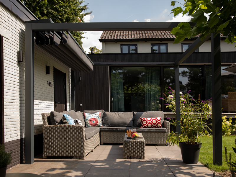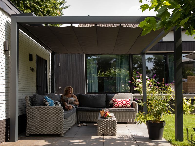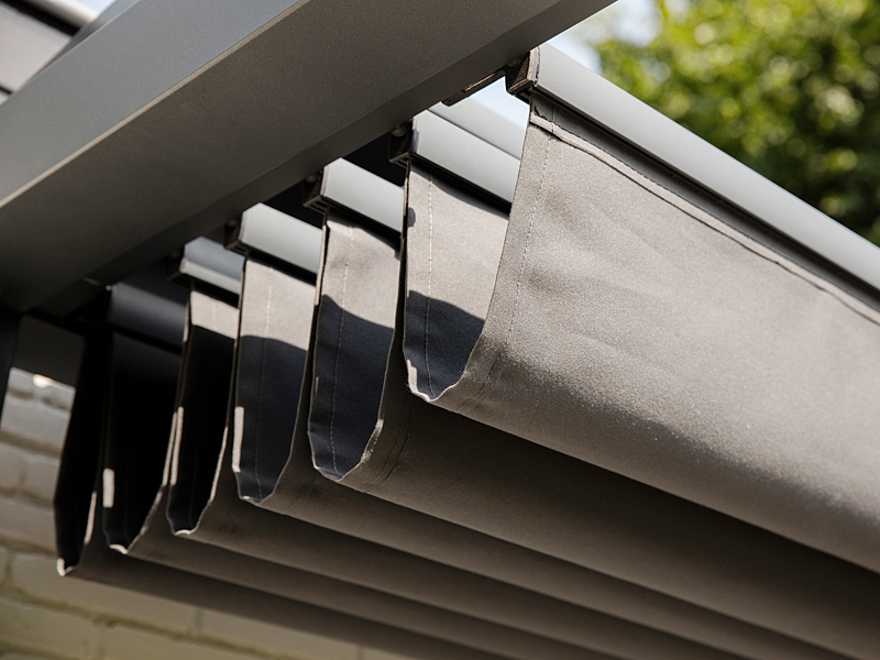 Baldahin HARMONIKA služi kot spremenljivo zasenčenje terase ali pergole. V primerjavi s ponjavo je njena prednost ta, da se lahko ročno izvleče, kar boste cenili predvsem v oblačnih dneh,
