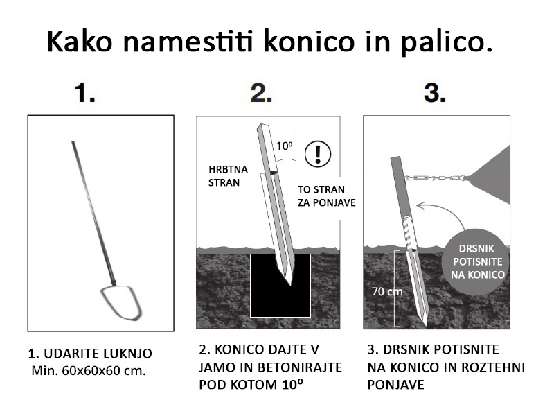 drog velja pravilo, da mora biti 1/3 dolžine droga v tleh. Priporočamo, da konice vedno zabetonirate. Prvo leto lahko konico le zabijete v tla in preizkusite, ali je na pravem mestu in ali