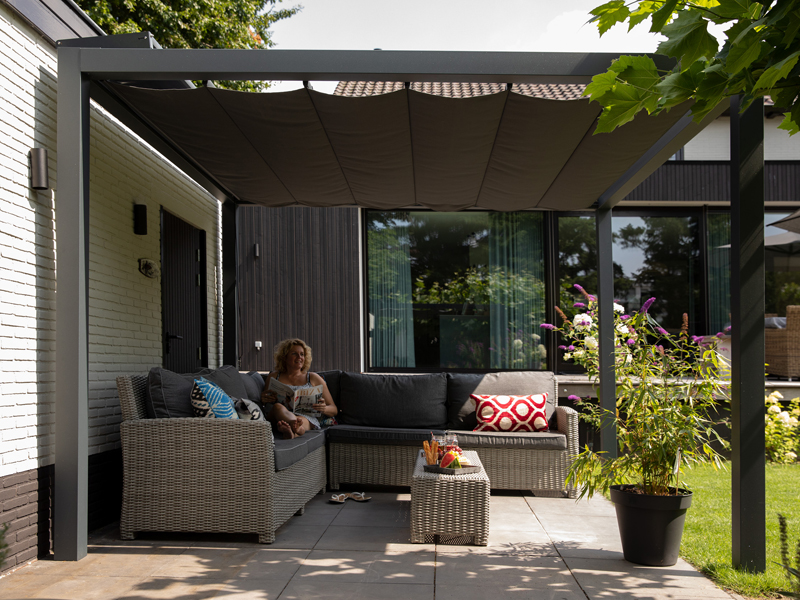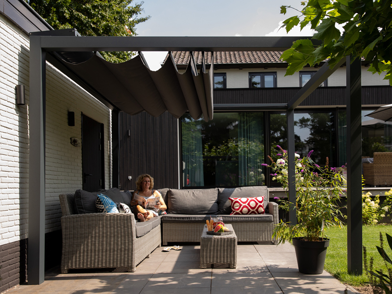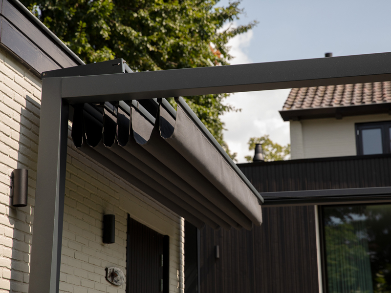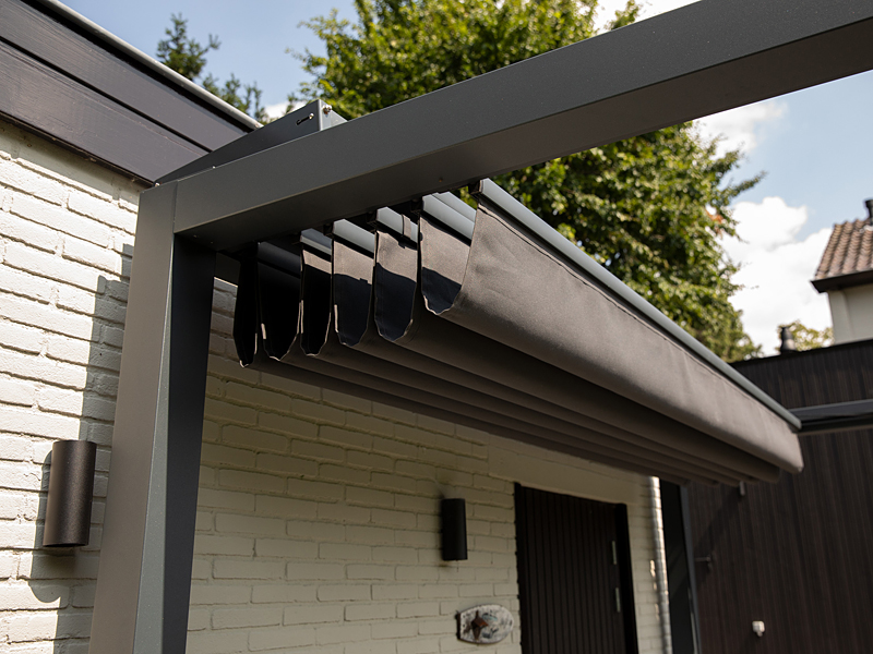 Baldahin HARMONIKA služi kot spremenljivo zasenčenje terase ali pergole. V primerjavi s ponjavo je njena prednost ta, da se lahko ročno izvleče, kar boste cenili predvsem v oblačnih dneh,
